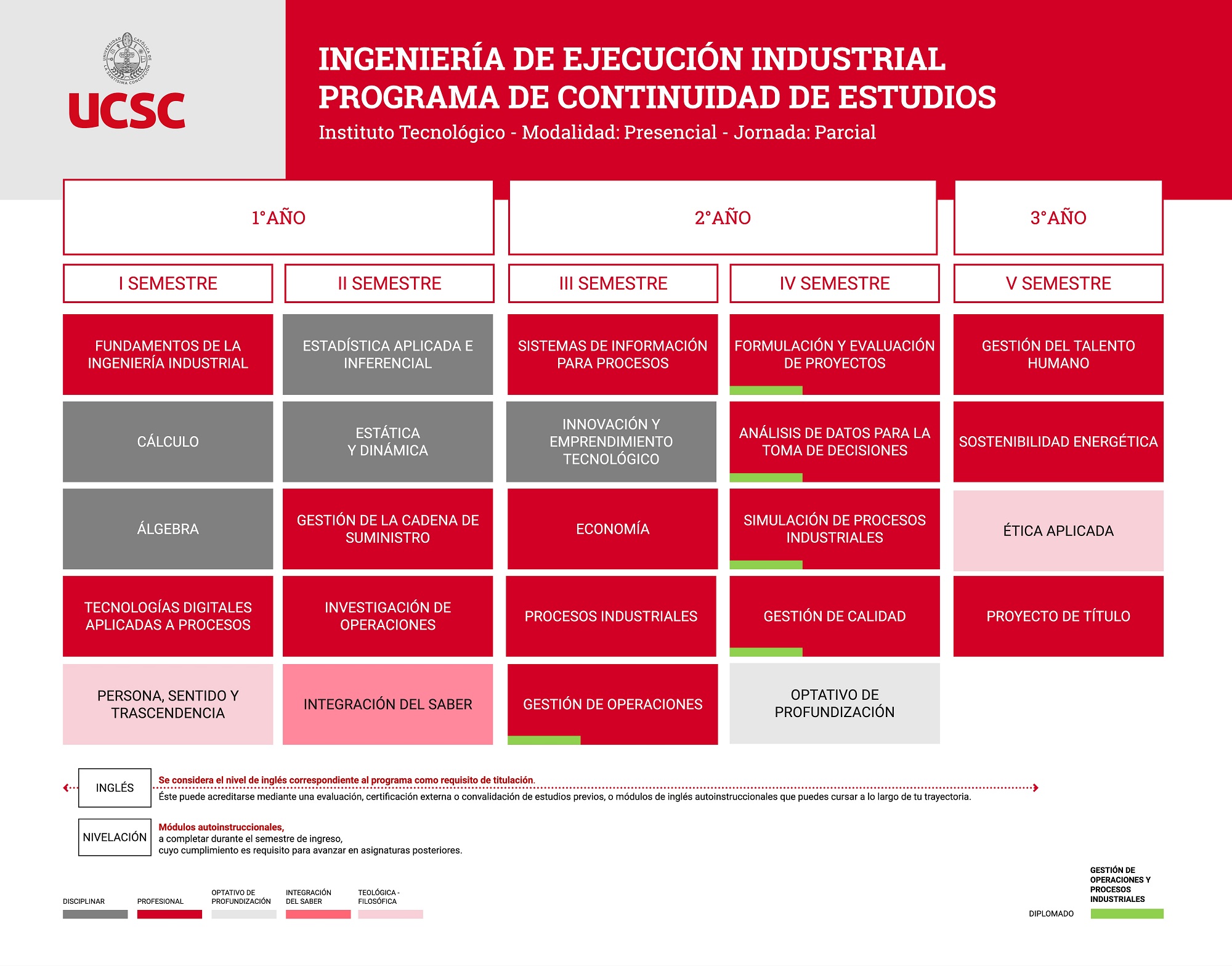 Se espera que el estudiante de la carrera Ingeniería de Ejecución Industrial, Programa de Continuidad de Estudios de la Universidad Católica de la Santísima Concepción, muestre interés en la gestión y optimización de procesos productivos y de servicios, en la formulación y evaluación de proyectos, y en la aplicación de conocimientos básicos de matemáticas, física, administración y tecnologías asociadas a la ingeniería industrial. Asimismo, que manifieste disposición para el análisis y resolución de problemas, el trabajo colaborativo y la comunicación efectiva en contextos multidisciplinarios.